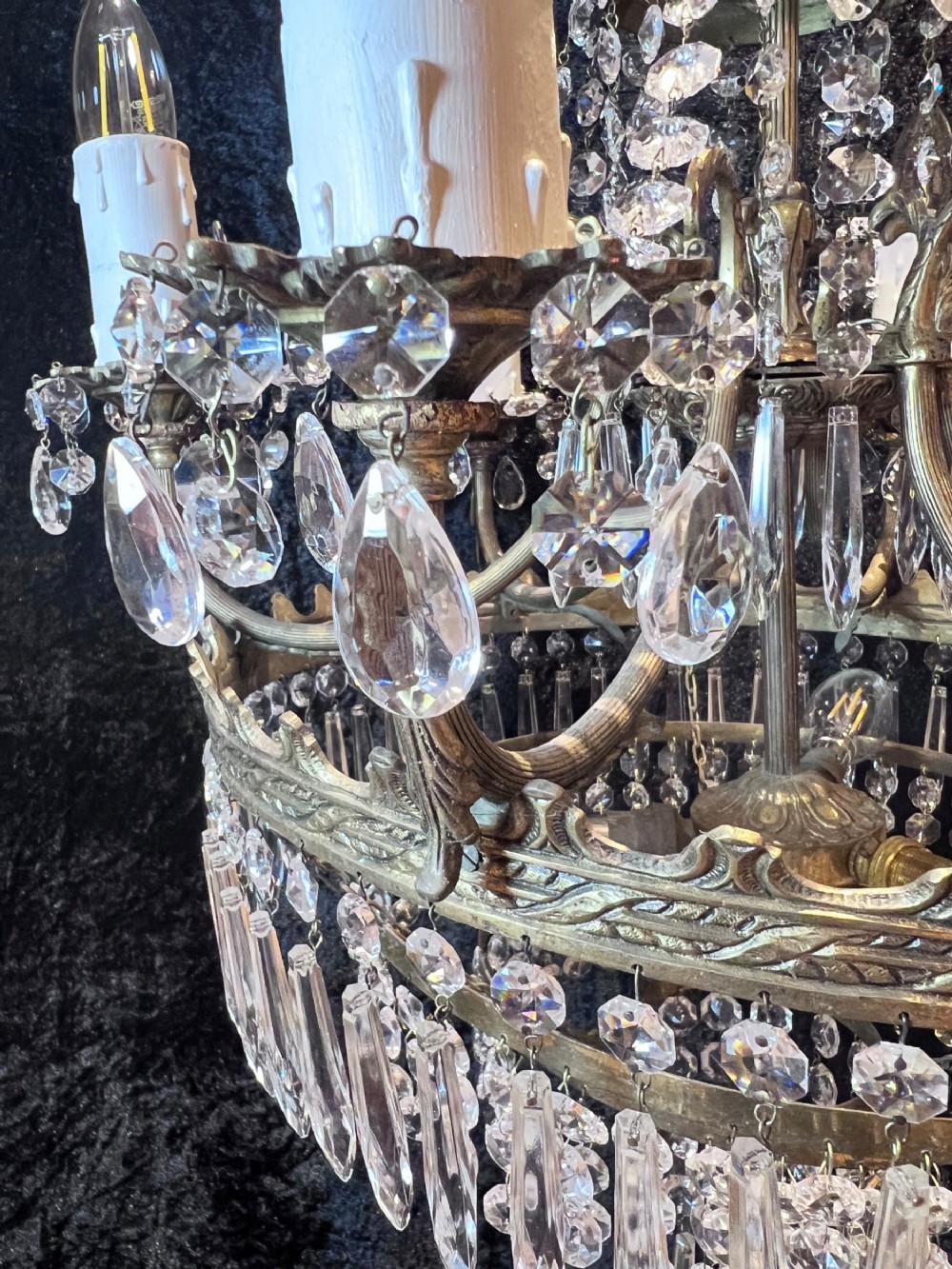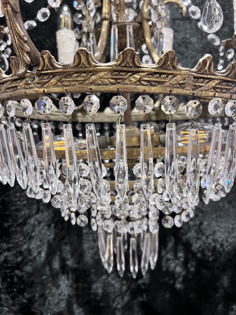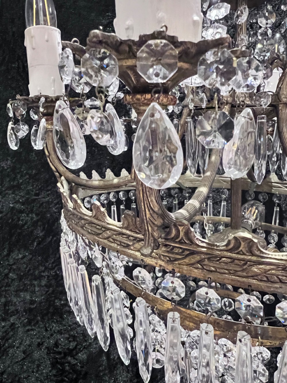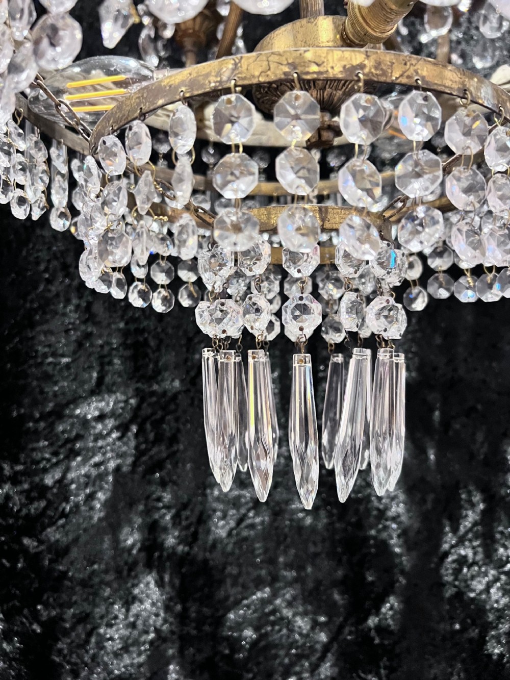 Here we have a classic antique French Empire chandelier with four waterfall tiers. With a decorative leafy top crown from which crystal button chains hang down into the bobeche drip pans and crystal drops with icicle drops hang down into the centre. An ornate circular brass ring issues six external leafy arms each holding pear drops and crystal buttons. The bottom waterfall is of four graduated rings holding icicle drops and crystal buttons and three internal lights shine through the waterfall crystals giving a pretty glow around the room. c1920's. Restored, wired, pat tested and ready to hang.