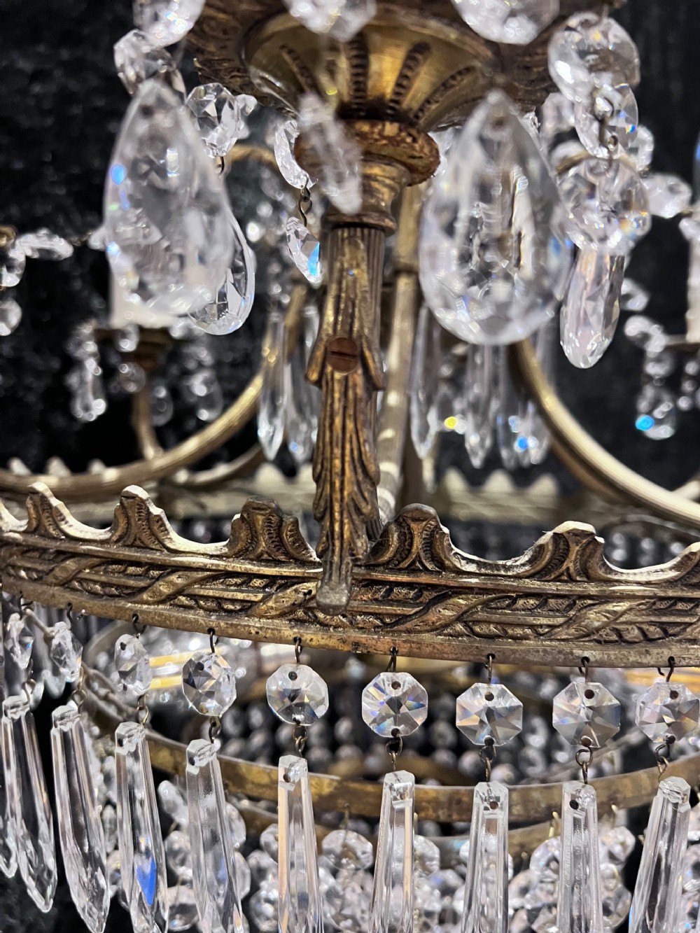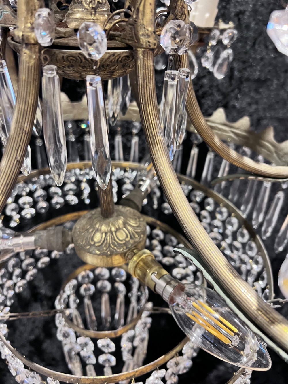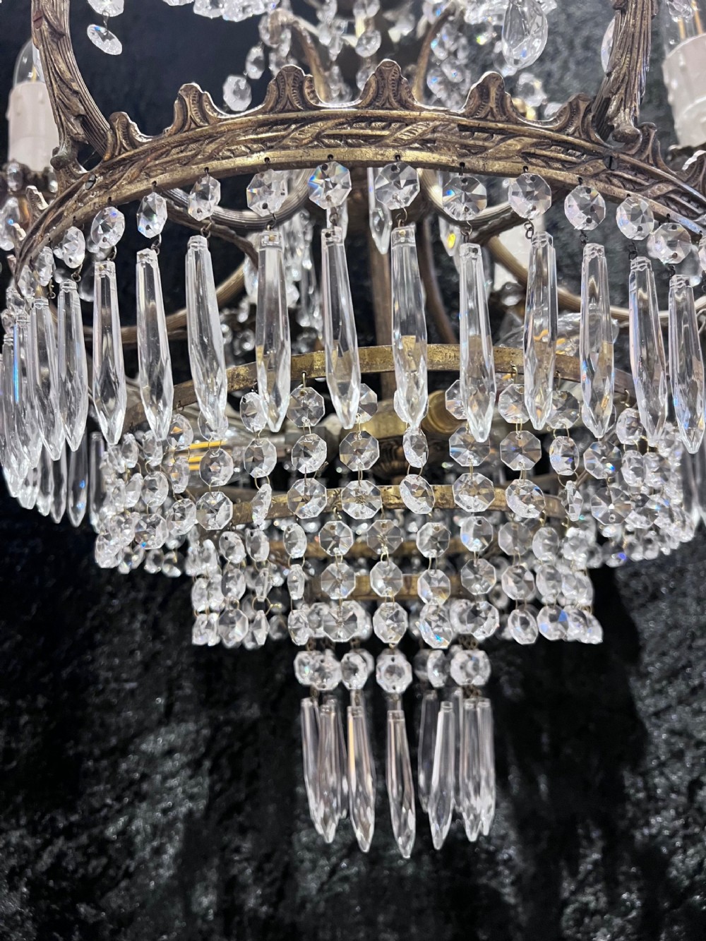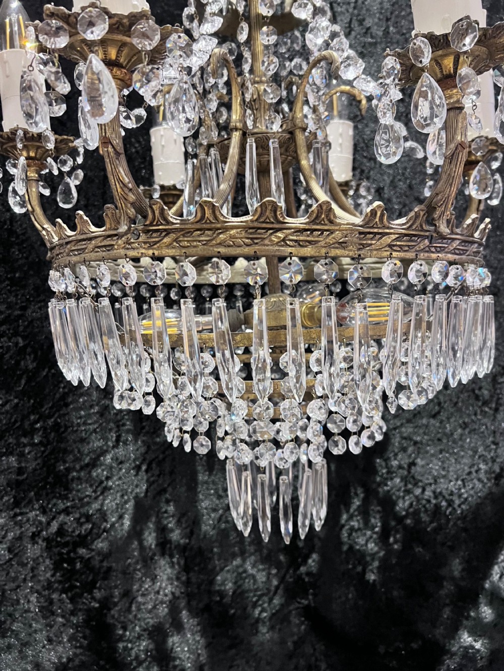 Here we have a classic antique French Empire chandelier with four waterfall tiers. With a decorative leafy top crown from which crystal button chains hang down into the bobeche drip pans and crystal drops with icicle drops hang down into the centre. An ornate circular brass ring issues six external leafy arms each holding pear drops and crystal buttons. The bottom waterfall is of four graduated rings holding icicle drops and crystal buttons and three internal lights shine through the waterfall crystals giving a pretty glow around the room. c1920's. Restored, wired, pat tested and ready to hang.