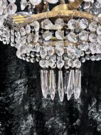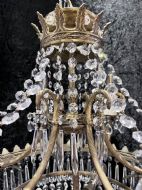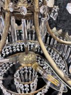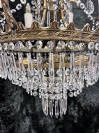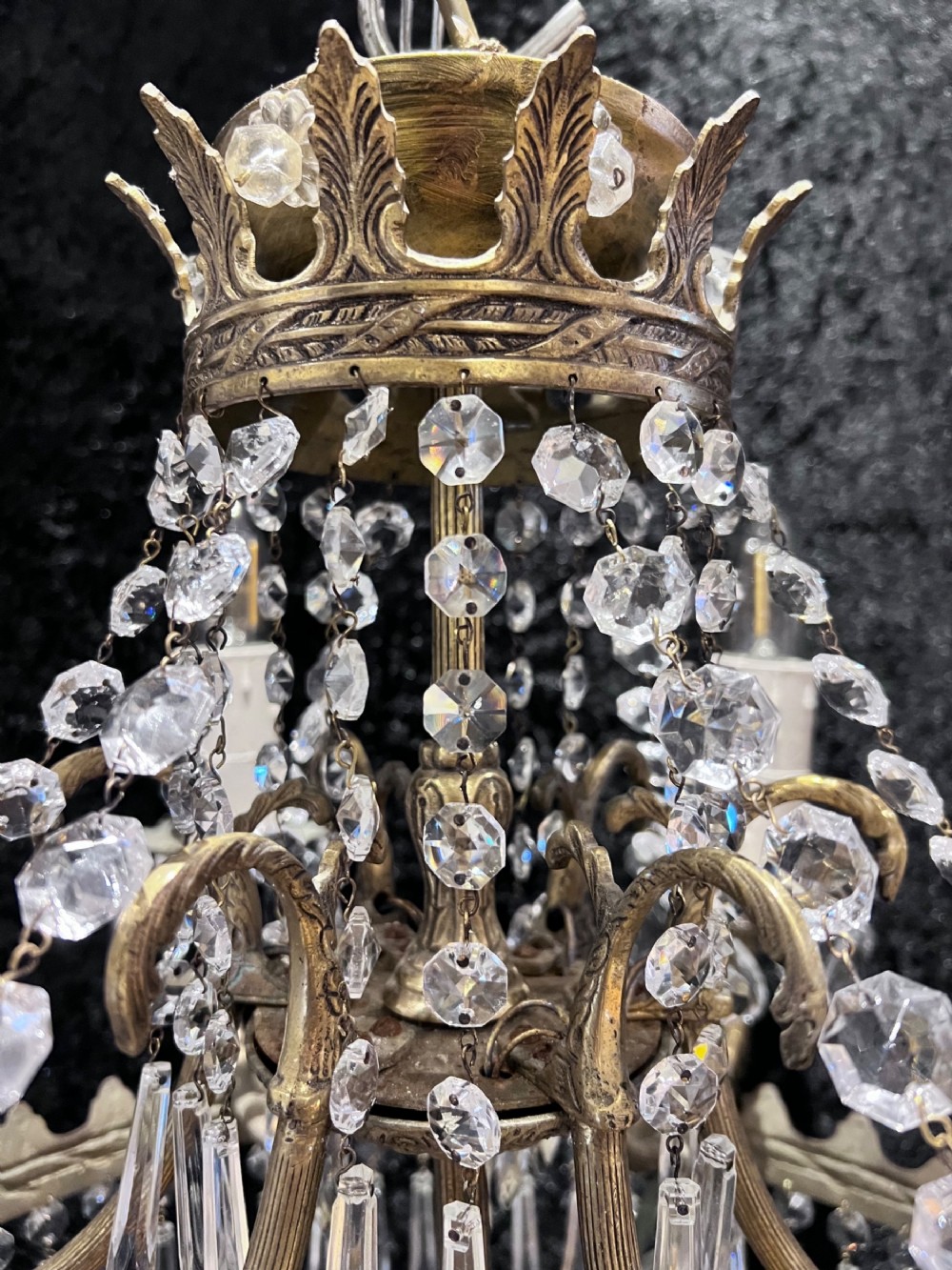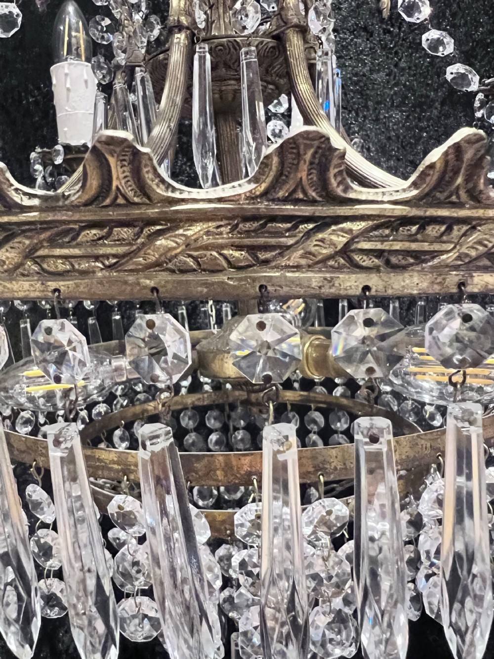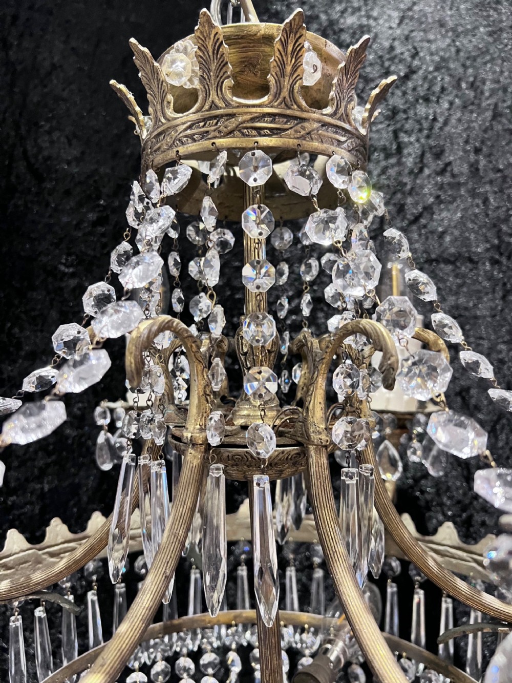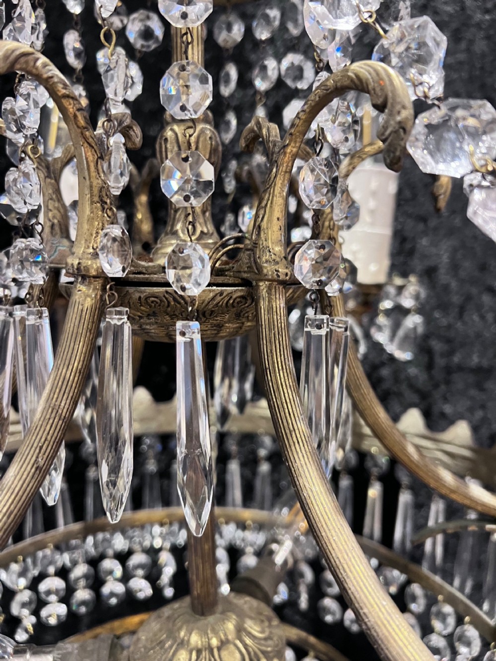 Here we have a classic antique French Empire chandelier with four waterfall tiers. With a decorative leafy top crown from which crystal button chains hang down into the bobeche drip pans and crystal drops with icicle drops hang down into the centre. An ornate circular brass ring issues six external leafy arms each holding pear drops and crystal buttons. The bottom waterfall is of four graduated rings holding icicle drops and crystal buttons and three internal lights shine through the waterfall crystals giving a pretty glow around the room. c1920's. Restored, wired, pat tested and ready to hang.
