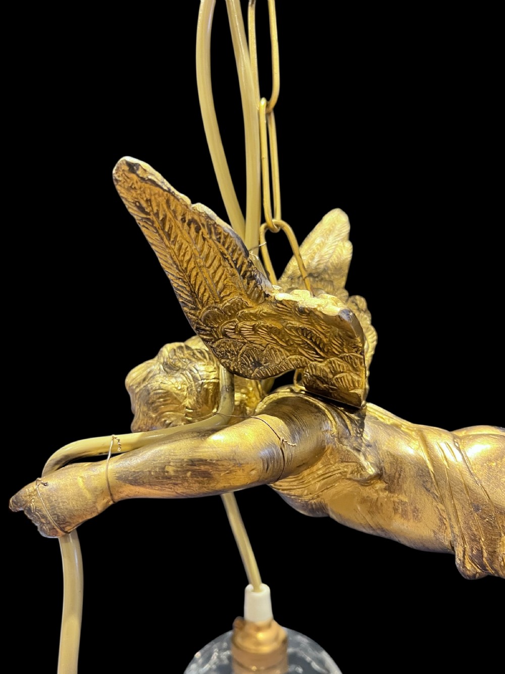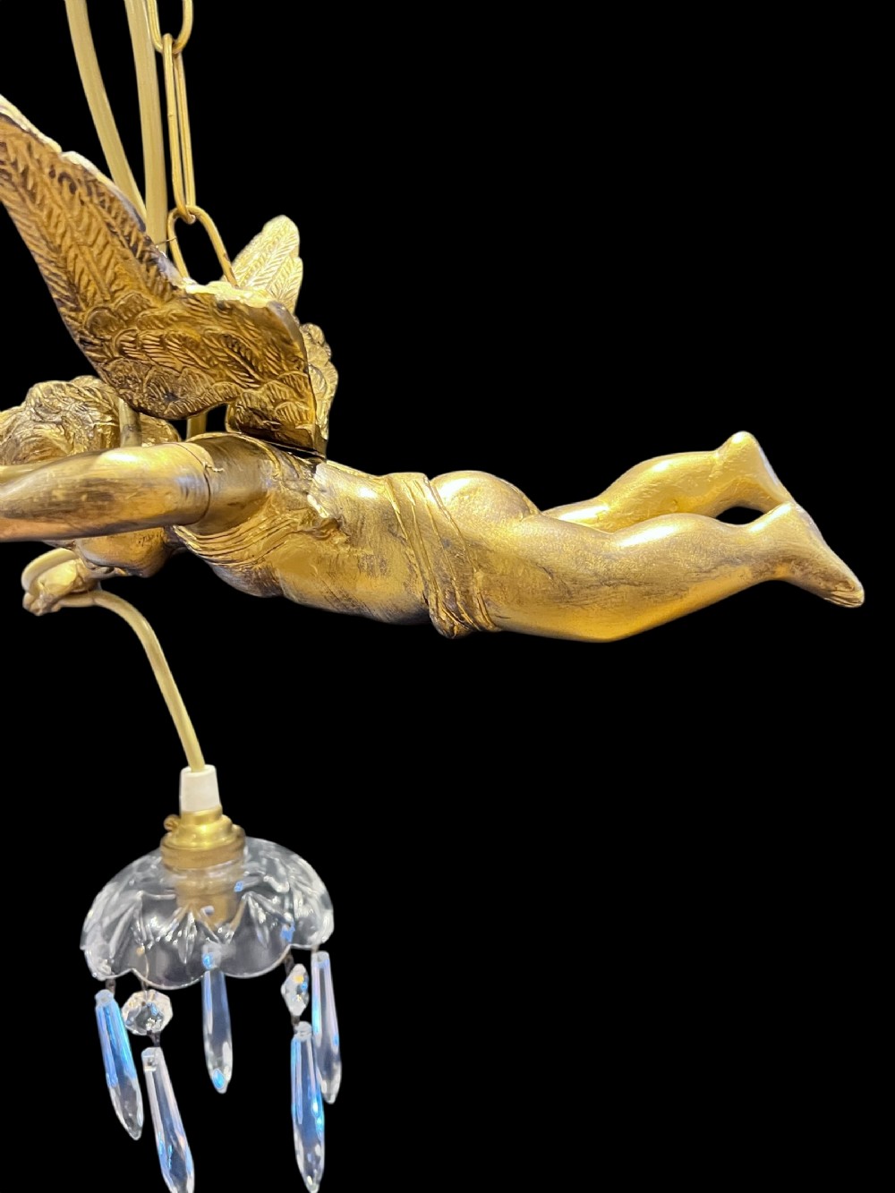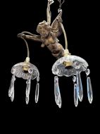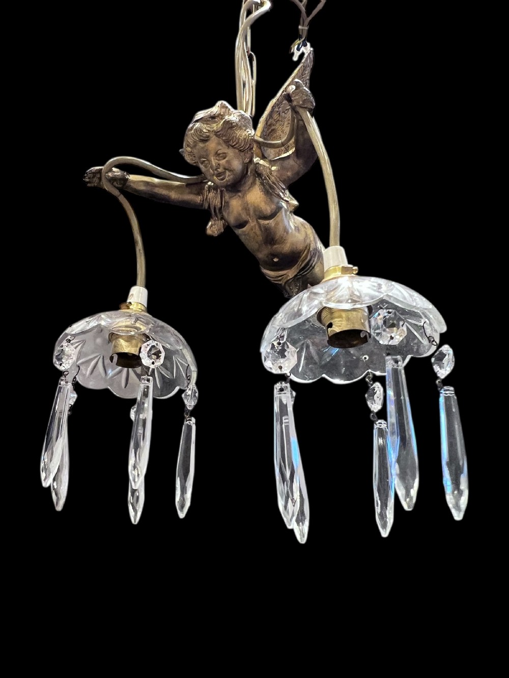 A lovely Italian gilt metal cherub chandelier from the 1920's period. Holding two lights with cut glass bowls from which dangle icicle drops, the angel has wings and a cute body form and with a great patina this super pendant would fabulous in any small space. c1920's. Restored, wired, pat tested and ready to hang.