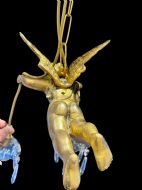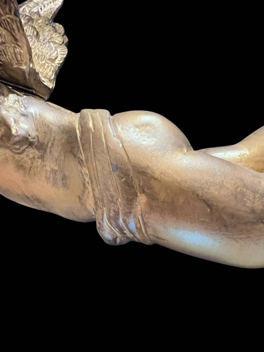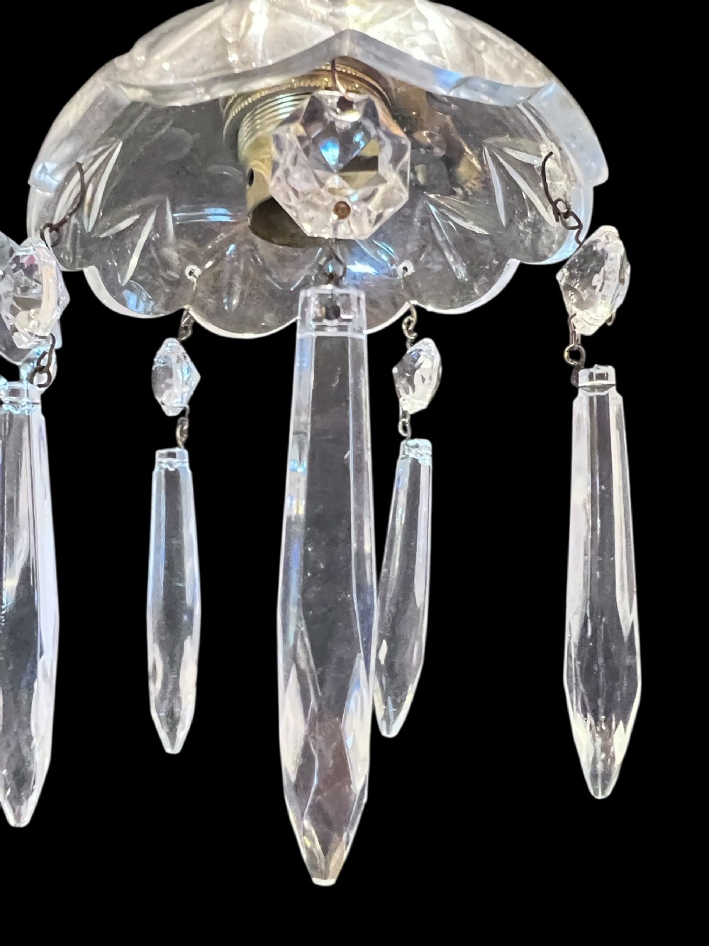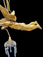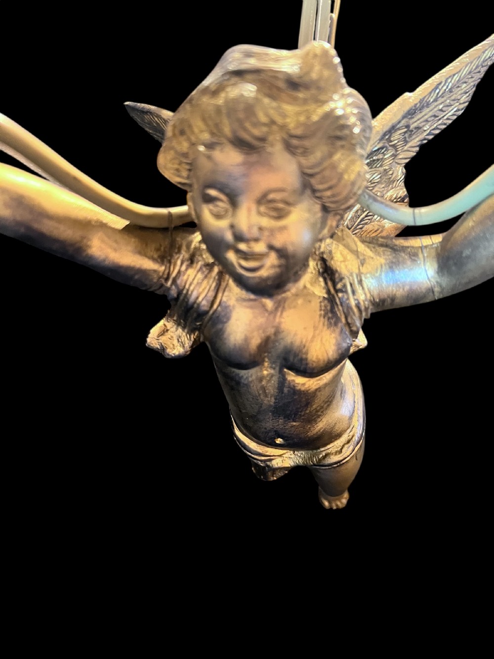 A lovely Italian gilt metal cherub chandelier from the 1920's period. Holding two lights with cut glass bowls from which dangle icicle drops, the angel has wings and a cute body form and with a great patina this super pendant would fabulous in any small space. c1920's. Restored, wired, pat tested and ready to hang.