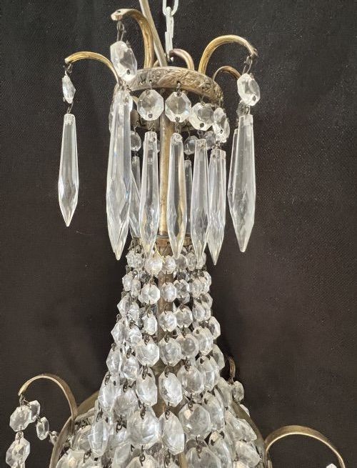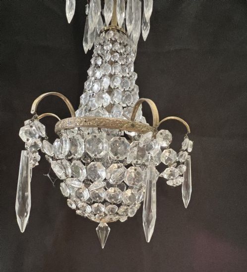 With a coronet of delicate brass arms protruding from a decorative brass ring from which dangle a row of icicle drops. The top swags are graduated button drops and gather into an ornate central brass band from which five delicate arms with icicle drops hang and a button chain hangs between the arms. The bottom 'bag' is of graduated buttons and gathers into a pretty bottom band with cut glass spire. c1920's . restored, wired, PAT tested and ready to hang