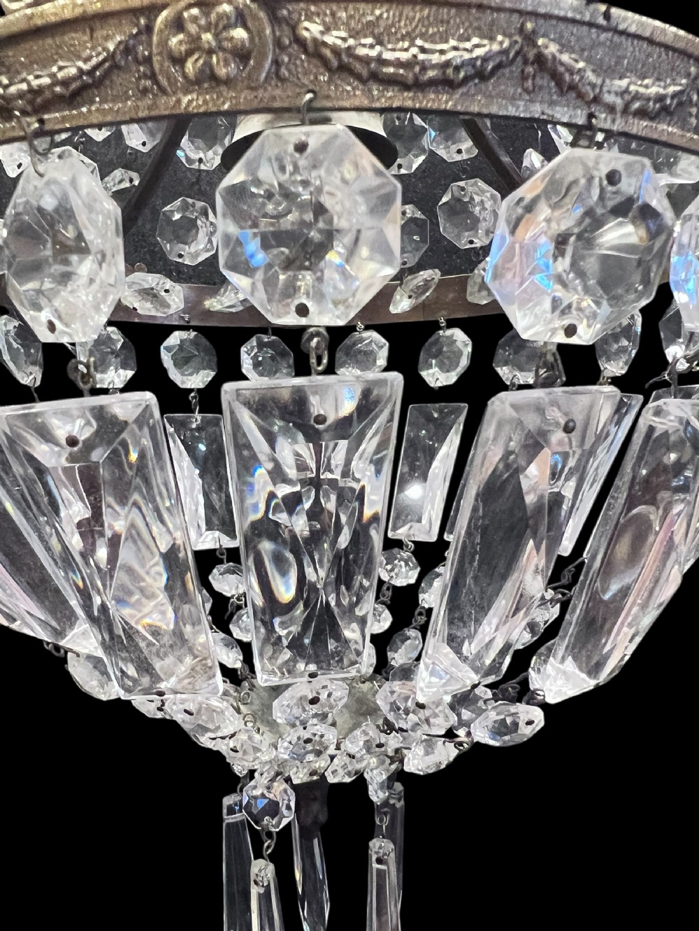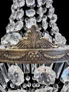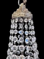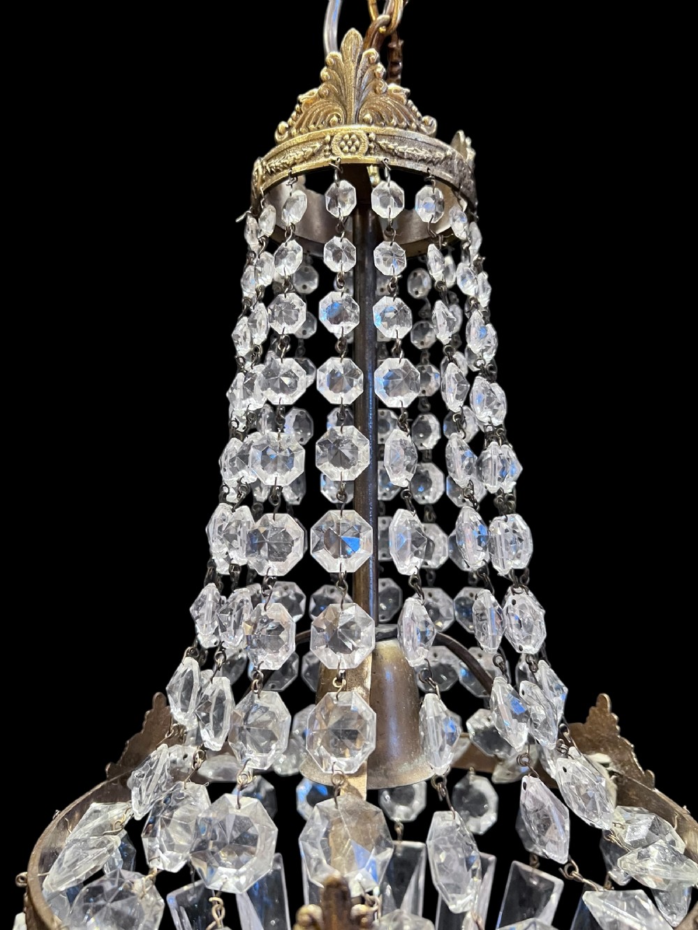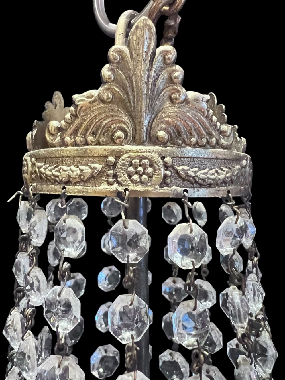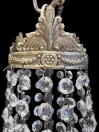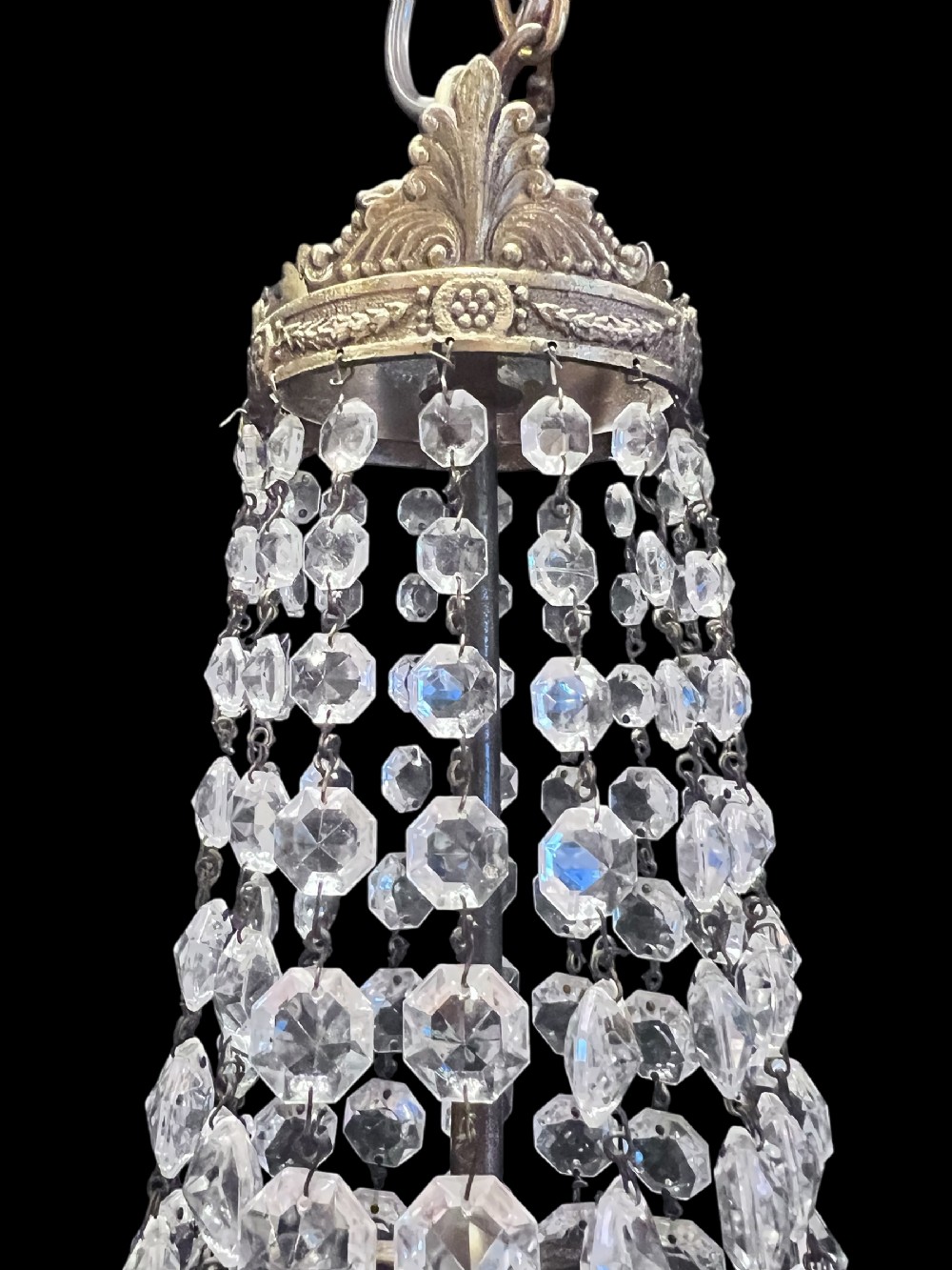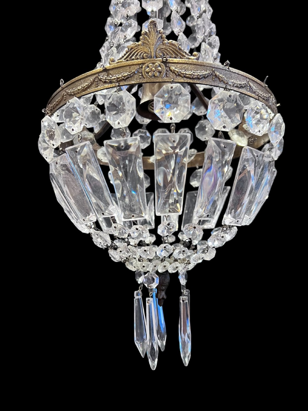 A single light traditional French antique chandelier with a top decorative crown from which hang graduated button chains which shroud the single bulb and gives a warm glow through the crystals when lit. The central brass ring has decorative motifs and is embossed with brass swags and the 'basket' hangs beneath and gathers into a bottom finial from which hang icicle drops. With a nice antique patina and with its original ceiling rose this chandelier would look good in a hallway, bedroom, landing or any small interior space. c1920's. Restored, wired, pat tested and ready to hang.