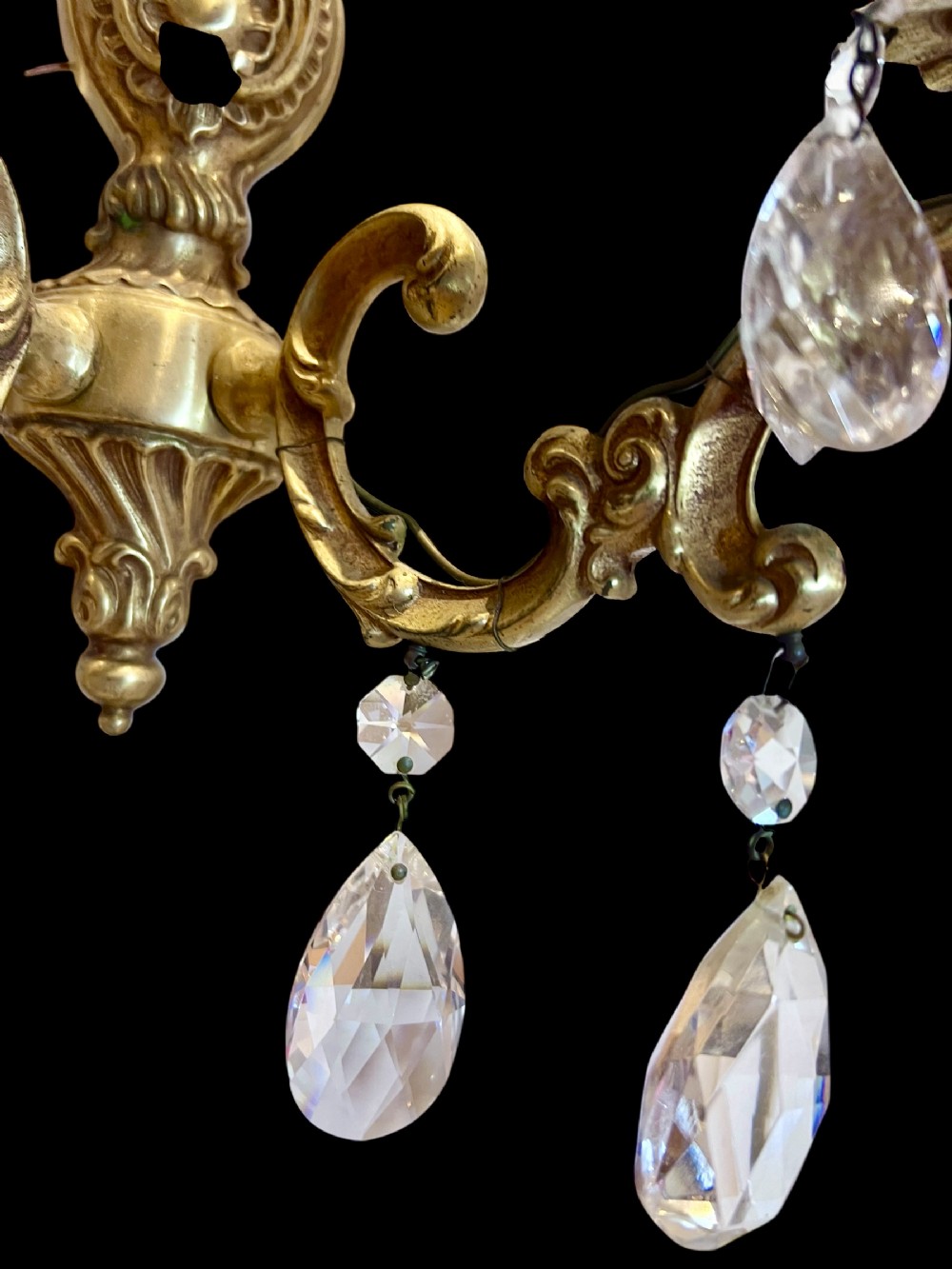 A good quality pair of antique French gilded brass and crystal appliques. With a flambeau brass finial on top of a highly decorative backplate with scrolling leafy arms and decorated overall with good quality pear drop crystals. With a super antique patina and good presence these fabulous wall-lights would look great in any interior space. early 20th century. Restored, wired, pat tested and ready to hang.
