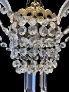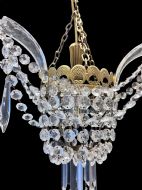 An unusual English antique chandelier with a filigree open brass frame from which three perspex leaves hang from. Crystal swags hang between the perspex features and a large icicle drop dangles from two four hole button drops. The 'bag' is of graduated buttons, the single bulb holder hangs in the centre of the bag and the light shines through the glass giving a lovely soft glow. A coffin drop with a small crystal button finish off this unusual chandelier. c1940's