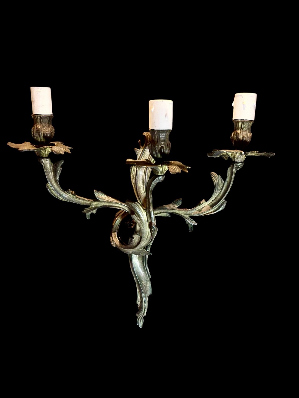 A set of 4 French antique brass triple arm wall lights, the tiered leaf clad scrolling arms with leaf bobeche drip pans and a rococo leafy frame and with a great antique patina this set of 4 would look good in any interior space. c1920's Restored, wired, PAT tested and ready to hang.