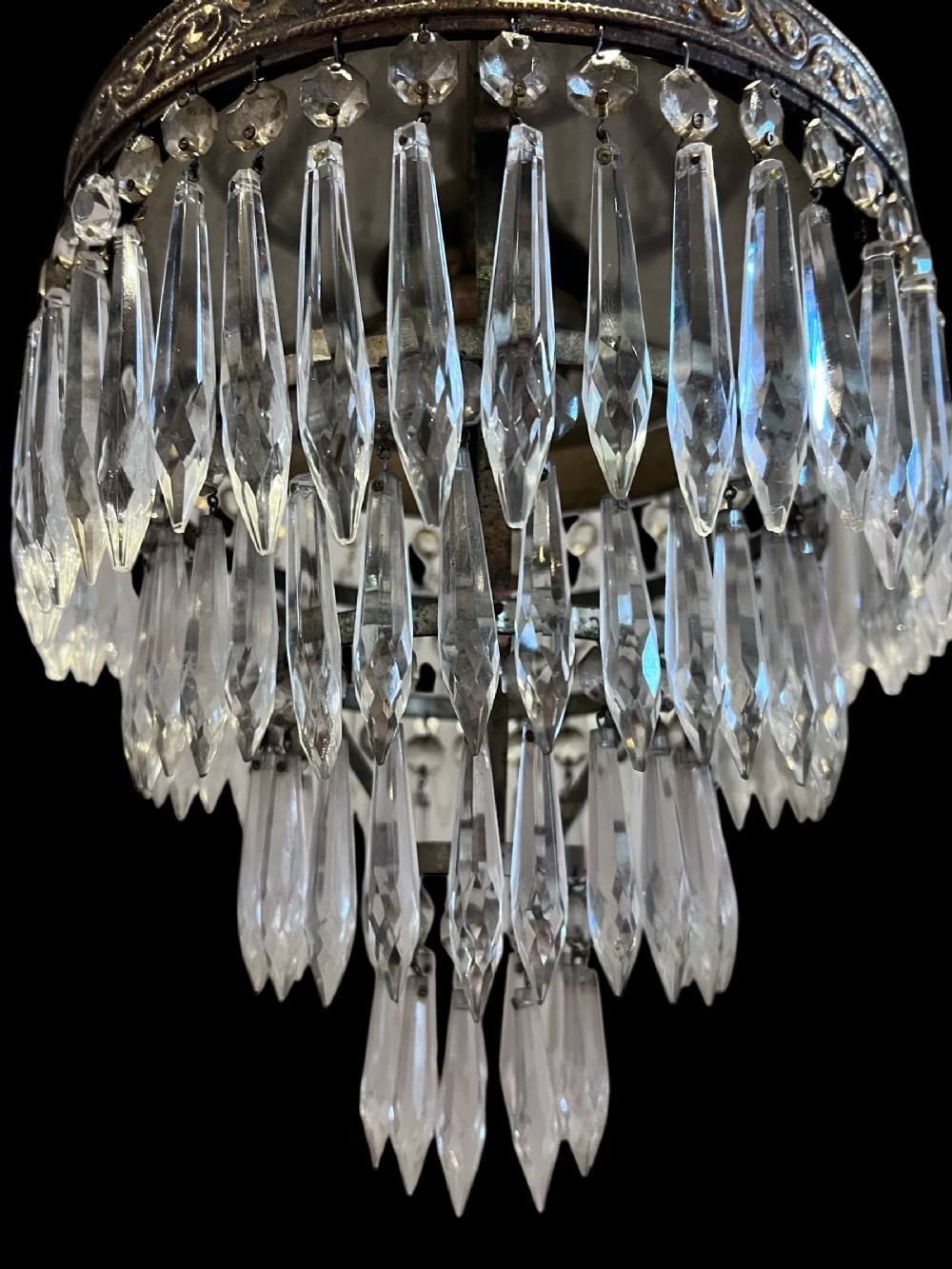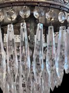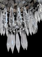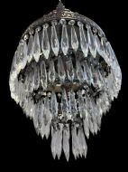 A traditional three tier waterfall chandelier from the south of France. With a decorative top crown, three tiers of graduated icicle crystals and a single light which is shrouded by the crystals giving a warm glow when lit. This style of chandelier is designed to be hung close to the ceiling so ideal for interior rooms with low ceilings. C1920’s. Restored, wired, pat tested and ready to hang.