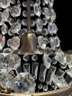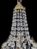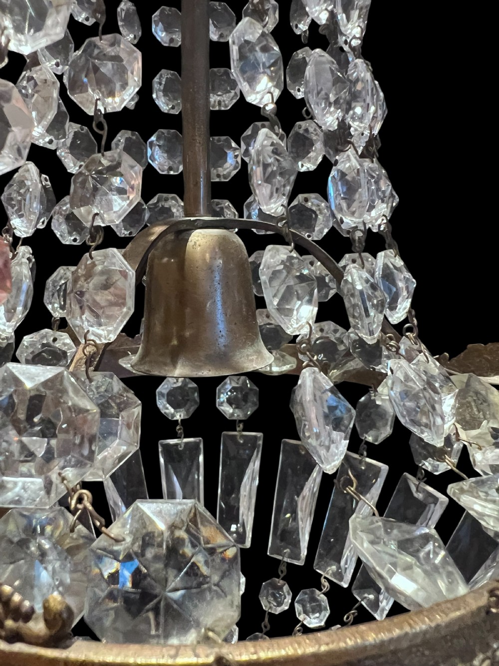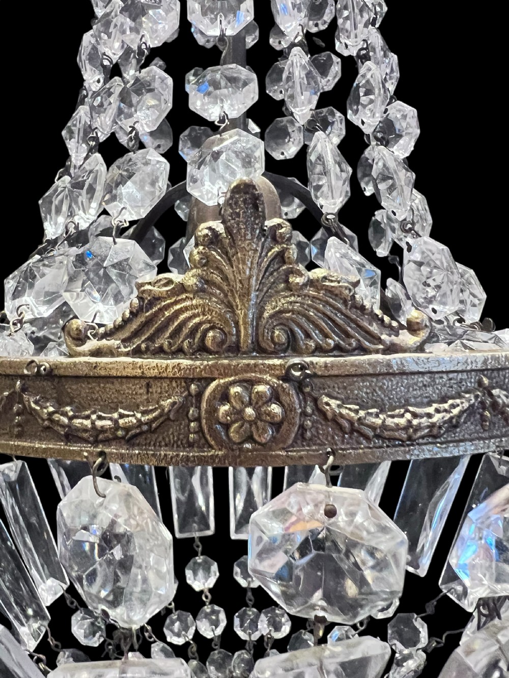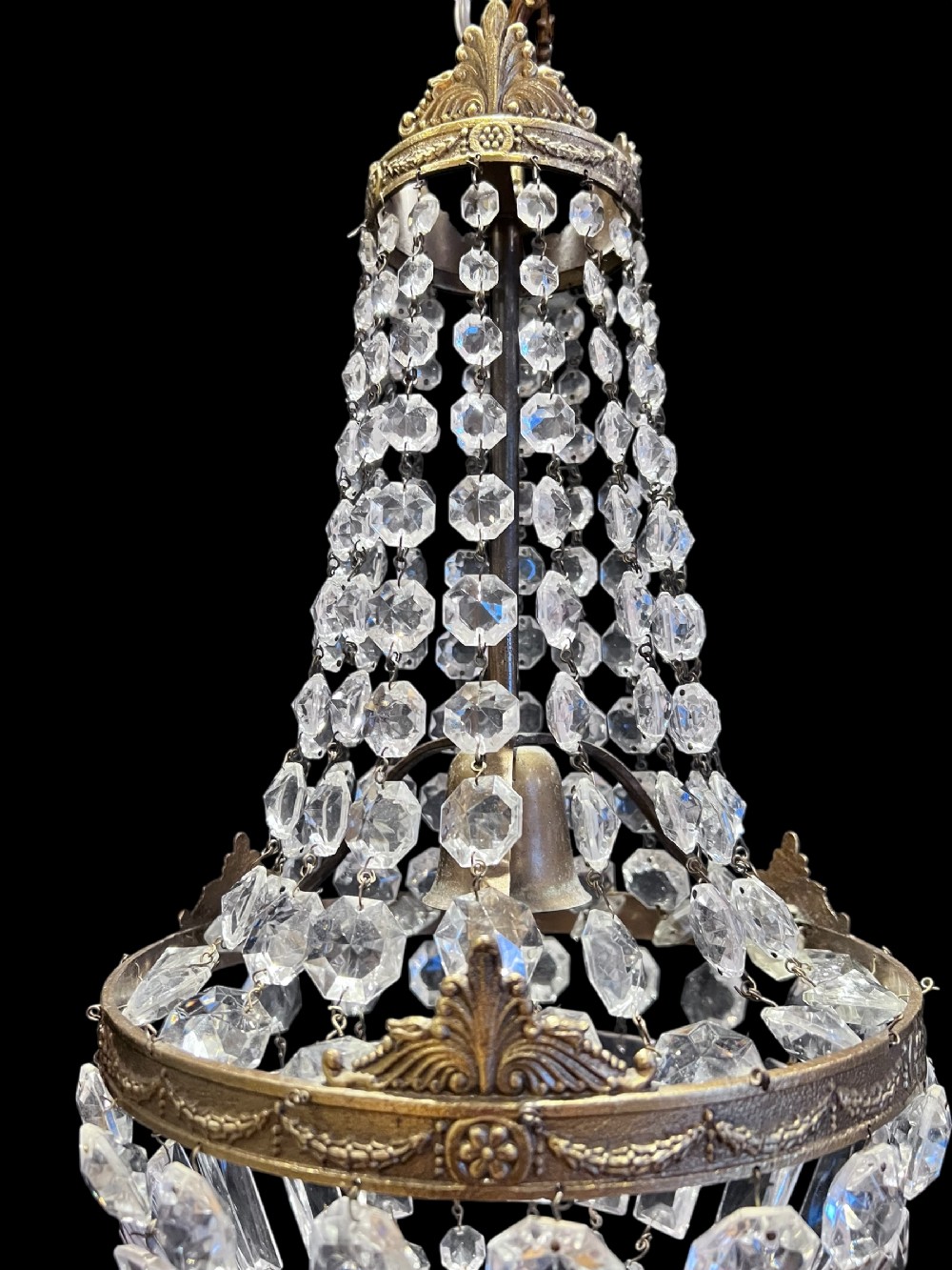 A single light traditional French antique chandelier with a top decorative crown from which hang graduated button chains which shroud the single bulb and gives a warm glow through the crystals when lit. The central brass ring has decorative motifs and is embossed with brass swags and the 'basket' hangs beneath and gathers into a bottom finial from which hang icicle drops. With a nice antique patina and with its original ceiling rose this chandelier would look good in a hallway, bedroom, landing or any small interior space. c1920's. Restored, wired, pat tested and ready to hang.