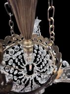 An unusual English antique chandelier with a filigree open brass frame from which three perspex leaves hang from. Crystal swags hang between the perspex features and a large icicle drop dangles from two four hole button drops. The 'bag' is of graduated buttons, the single bulb holder hangs in the centre of the bag and the light shines through the glass giving a lovely soft glow. A coffin drop with a small crystal button finish off this unusual chandelier. c1940's