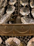 A dark framed French Empire single light chandelier in a traditional style. With a decorative top coronet from which hang chains of graduated button drops gathering into a decorative central band. The. bottom 'bag' is of graduated button drops gathering into a bottom brass finial. c1910. Restored, wired, PAT tested and ready to hang.