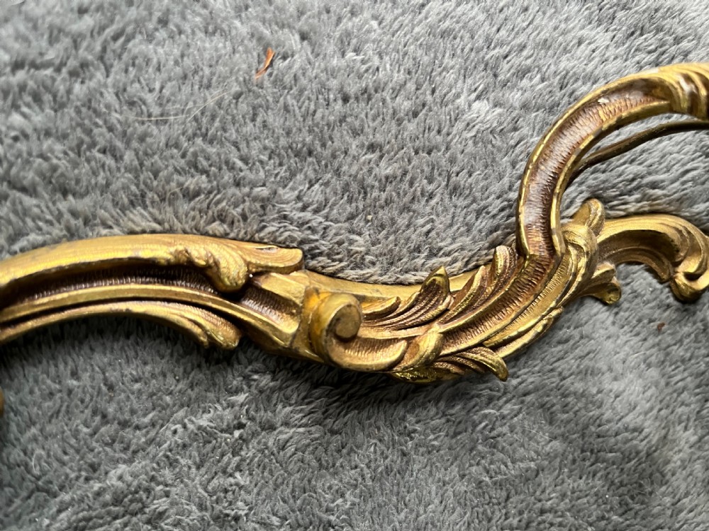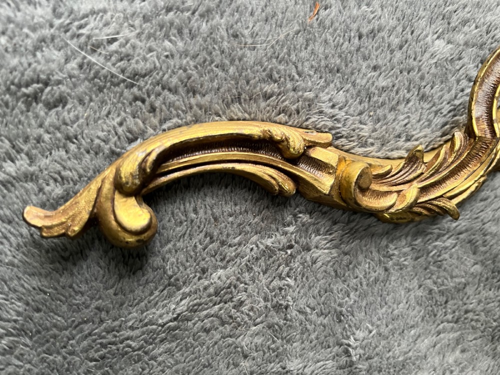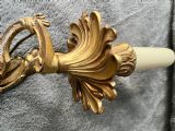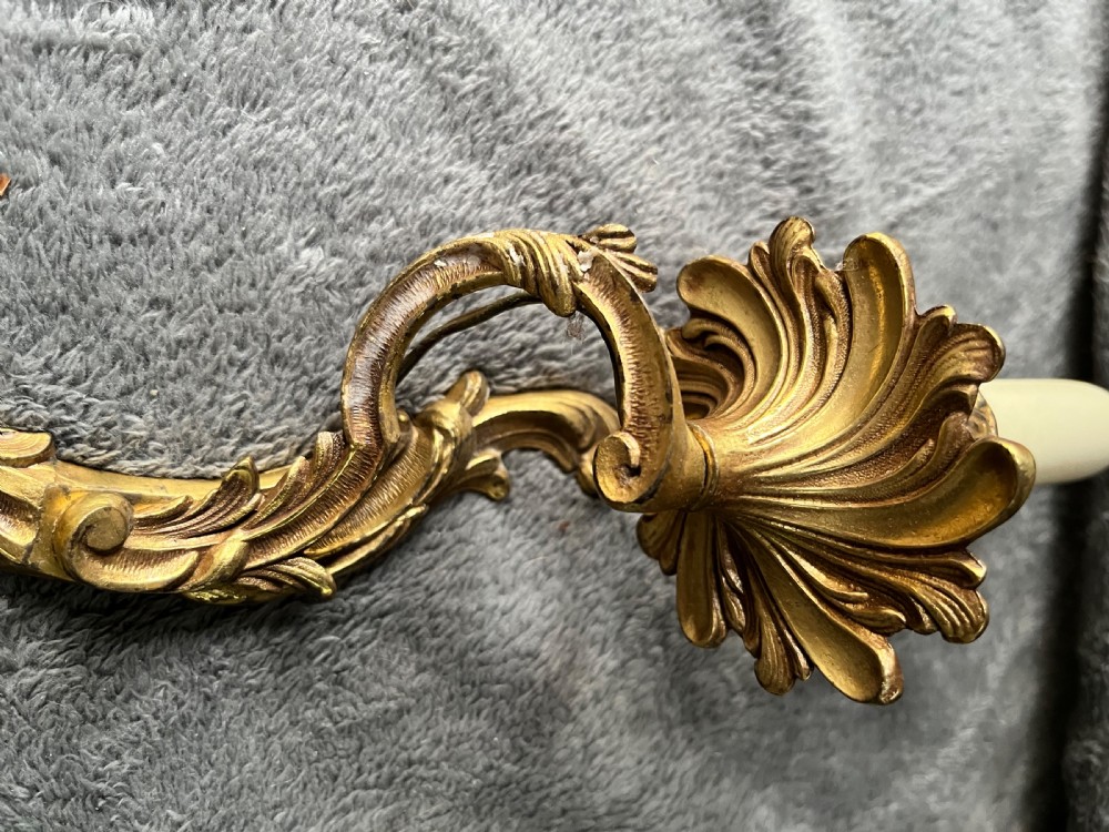 A traditional French brass rococo wall-light with a swirling rococo main body and two scrolling leafy arms each holding a leafy bobeche trip tray and light fitting. Wired, Pat tested and ready to hang.