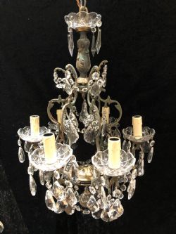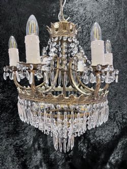 A traditional Italian brass and crystal five arm chandelier, radial chains hang from the top brass decorative dish, they split into two incorporative a three hole oval drop and gather into the outer swags. Five decorative arms each holding decorative brass bobeche drip-pans issue from the simple central stem. The chandelier overall is dressed with swags of button chains, small bomb and French slab drops. A well balanced chandelier with good proportions.